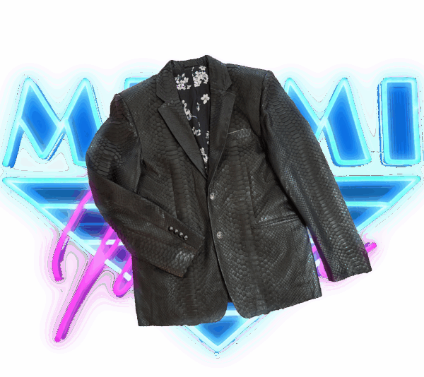 Semi-formal with a natural snakeskin pocket square and four-button spiked cuffs; finished with carved Jefferson nickel joker front buttons.